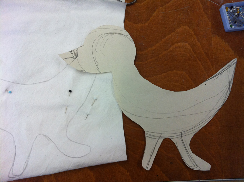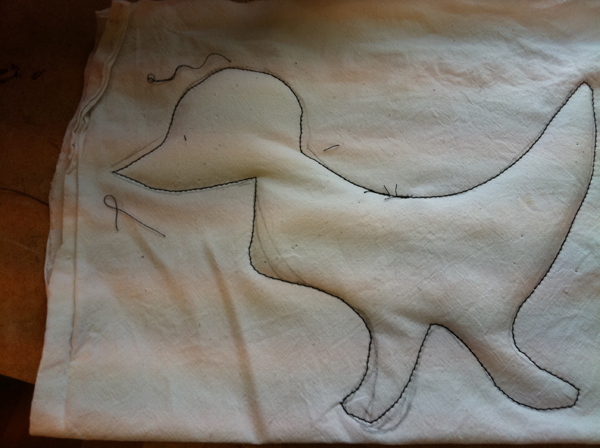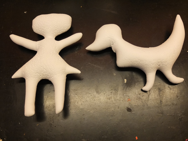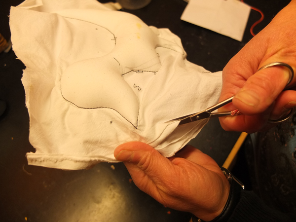 Form auf aufzeichnen und auf Stoff übertragen. Umnähen. Eine Stelle offen lassen und dort hindurch die Styropor-Kügelchen füllen (ca. 2mm).